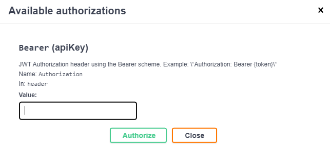 When you click the authorize button, enter the token you've received by email into the 'Value' input (as seen below). Then submit using the 'Authorize' button.